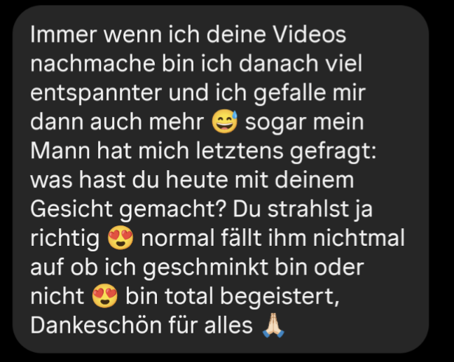 In meiner Glow & Lift Challenge lernst du, wie du mit Gesichtsmassagen, Gesichtsyoga und Körperübungen deine Haut auf natürliche Weise straffst, deinen Körper aufrichtest und Falten deutlich reduzierst. Kopfschmerzen, Verspannungen und Zähneknirschen werden sich verbessern und du erhälst mehr Selbstbewusstsein und Selbstliebe!😍
