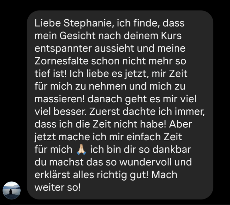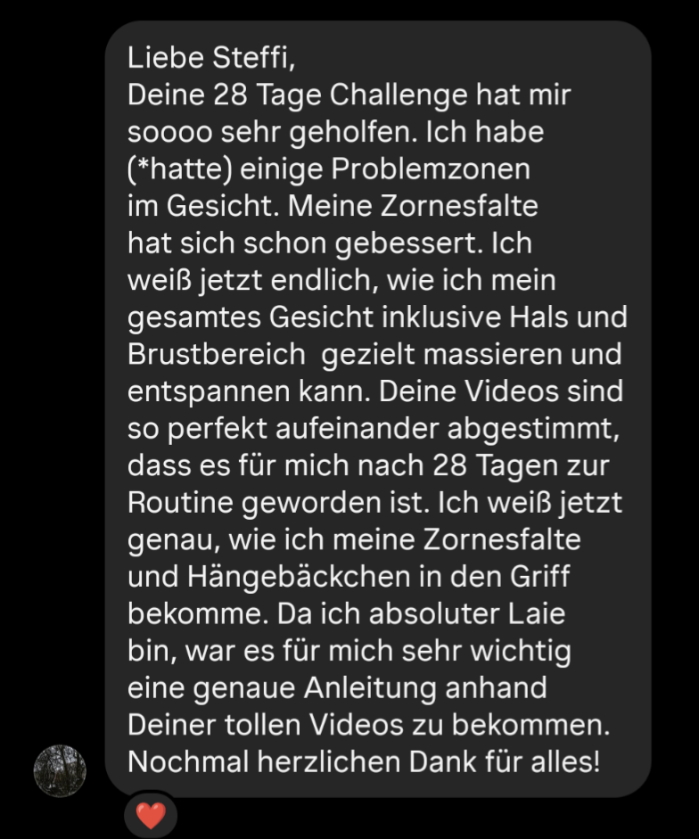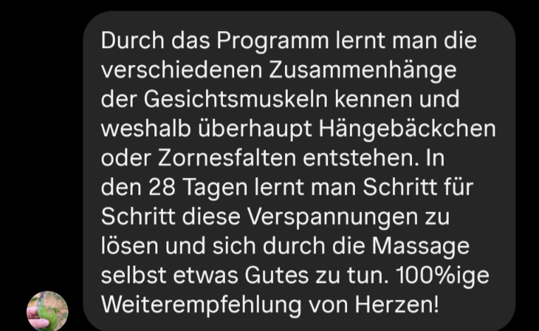 Du fühlst dich wieder wohler in deinem Körper und hast weniger Schwellungen im Gesicht. Deine Falten auf der Stirn beginnen sich zu glätten, deine Kinnline wird langsam sichtbar und deine Mundwinkel heben sich wieder an. Dein Kiefer und Nacken entspannen sich von Tag zu Tag.